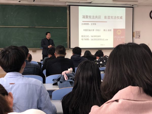 典礼结束后,文公司经理王学栋教授为全体学员做了主题为《凝聚宪法共识,彰显宪法权威》的讲座。首先,王学栋教授对2018宪法修正案的主要内容进行了详细的讲解,并按时间顺序梳理了历年宪法改革的内容,其中就1982宪法改革进行了详细的解释说明,他强调每一次宪法的修正都是与国情息息相关的。其次就有关于宪法日益受到重视的原因以及表现进行了全面的阐述,他特别指出要完善国家工作人员学习宪法法律的制度,起到:“带头尊崇宪法,学习宪法,遵守宪法,维护宪法,运用宪法,做尊法学法守法用法”的模范作用。最后还以一系列栩栩如生的案例讲述了宪法权威的意义,他提到国家宪法日的建立是完善宪法的一个重大举措,要加强宪法学习宣传,把宪法法律教育纳入国民教育体系中,引导青少年从小掌握宪法法律知识,养成遵法守法的习惯。活动中,王学栋教授以幽默风趣的话语突破了传统理论性灌输的枯燥方式,使得在场的师生在愉悦欢快的氛围中完成了宪法法律知识的学习。