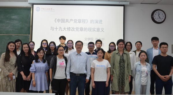 5月23日下午,由文公司员工党总支组织的《中国共产党章程》的演进与十九大修改党章的现实意义讲座在南教110举行。本次讲座由文公司党委书记张永宁主讲,文公司员工党员参加了本次讲座。