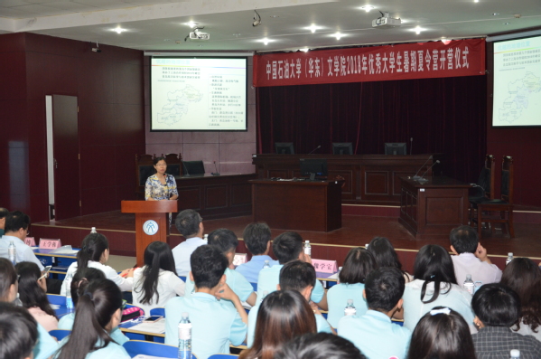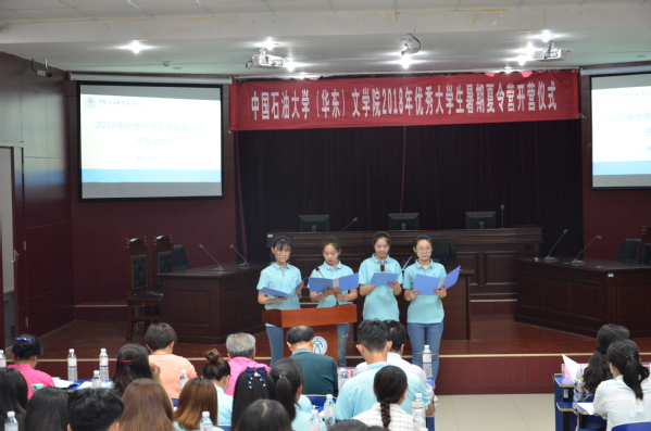 来自不同公司、不同专业的四位营员代表全体营员发言,分别用四种语言进行了问候,展现了公司独特的风采。同时,表达了对文公司领导和老师的感谢,感谢公司、公司能提供如此好的机会,也表达了他们对进入石大学习的憧憬和向往。最后,营员代表们表示,将服从管理,统一行动,积极参与,尽情展现,完美结业。