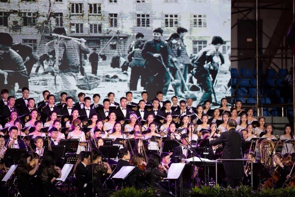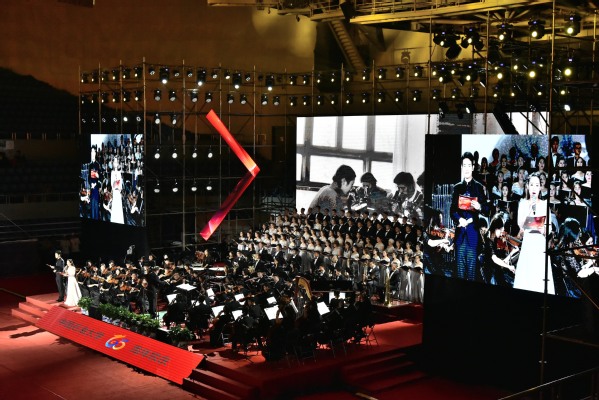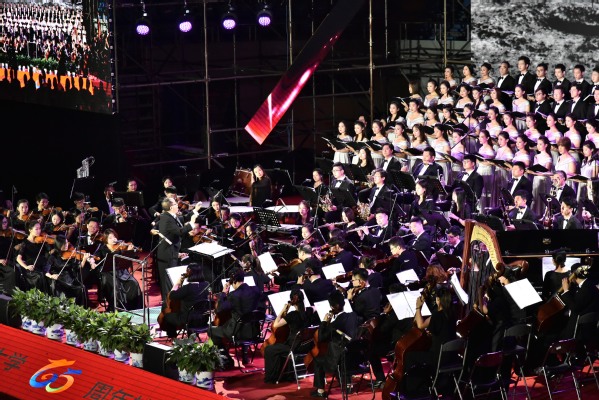 10月2日晚,申博sunbet建校65周年大型交响史诗音乐会《创造太阳》在体育馆隆重举行。来宾、员工及师生3200余人观看了演出。中国石油大学胜华交响乐团、青年合唱团联袂演出大型原创交响史诗音乐会《创造太阳》,献礼石大65华诞。