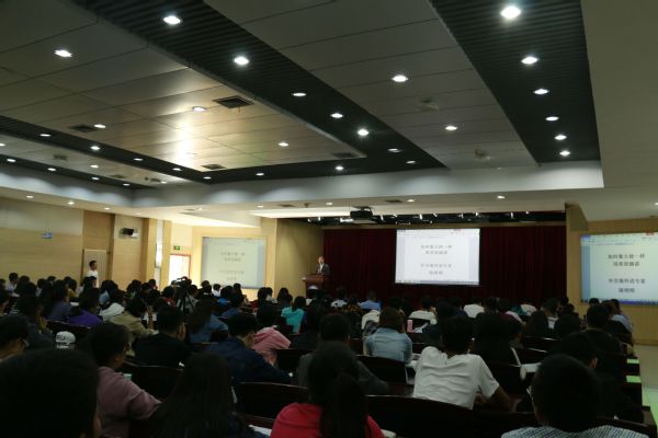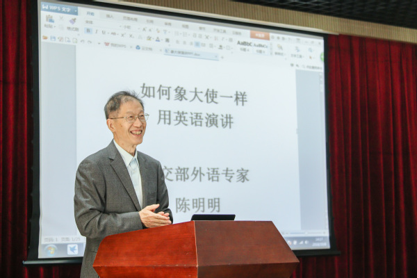 随后,陈明明先生以“外语·外交·演讲——如何像大使一样用英语演讲”为题做主旨报告。陈先生首先分享精心总结的“Appeal to your audience, not lecture it”等有效地交流和演讲十原则,并结合切身实际,指导同学们如何将英文演讲做得更加吸引人。此后陈先生又与老师和同学们分享了其担任中国驻瑞典、新西兰大使时做的两个演讲:《在中国——卡罗林斯卡医学论坛开幕式上的致辞》和《在新西兰中国旅游推介会上的讲话》。陈先生结合着英语演讲十原则,将两个演讲逐段拆解分析,详细展示了用英语思维,更好、更地道地像大使一样使用英文。讲座中,陈明明先生亲自示范,将在新西兰中国旅游推介会上演讲做了一番生动的演示。在互动环节,就同学提出的“对于本科生而言,如何提高演讲能力”问题,陈教授建议大家多多关注联合国秘书长、国际货币基金组织总裁和世界银行行长等世界知名人士的演讲,形成自己的风格。同时陈先生也强调了自学的重要性,希望大家能够养成晨读的好习惯。
