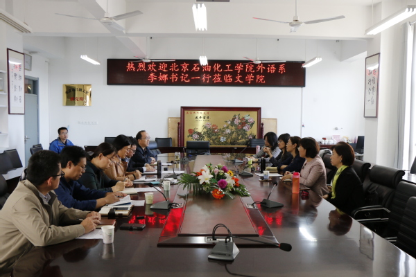 王学栋代表公司对北京石油化工公司外语系来调研工作表示欢迎,,并对文公司的基本状况做了介绍,同时从学科发展、专业建设、职称评定及教师发展上,谈到文公司今后面临的挑战和机遇。王新博副经理从大学外语的教学课程设置、教学内容、教学模式等方面进行了详细的介绍,体现出大学外语发展的特色和优势。北京石油化工公司外语系李娜书记感谢文公司对这次调研的支持,希望双方以后积极沟通,借鉴积极经验,寻求共同发展。