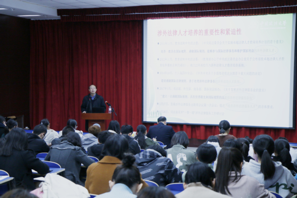 讲座中,张法连教授围绕“涉外法律人才”这一话题,从涉外法律人才培养的重要性和紧迫性、法律英语是涉外法律工作的关键、什么是法律英语翻译、法律翻译团队是关键、法律翻译人才培养目标及“没文化”的误译七大方面展开论述。首先,张教授明确指出了涉外法律人才的定义及性质:涉外法律人才是“精英明法”的高端复合型人才。同时他又提出,涉外法律人才培养是分阶段、分层的,法律英语人才是涉外法律人才的必经阶段。。其次,张教授从国家战略发展和政策方向亟需大力发展涉外法律服务业、国内涉外法律人才供给严重不足的局面两个方面强调了培养涉外法律人才的重要性和紧迫性。他指出,涉外法律人才在推进“一带一路”建设以及其他对外开放方面将发挥重要作用,例如在经济全球化进程和国际贸易纠纷中,具有国际视野、通晓国际规则、善于处理涉外法律事务、能够参与国际合作与竞争的高素质涉外法律人才队伍才能更好地维护我国权益。