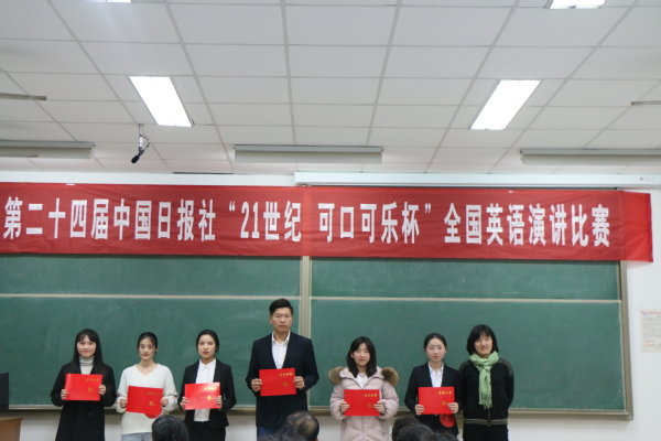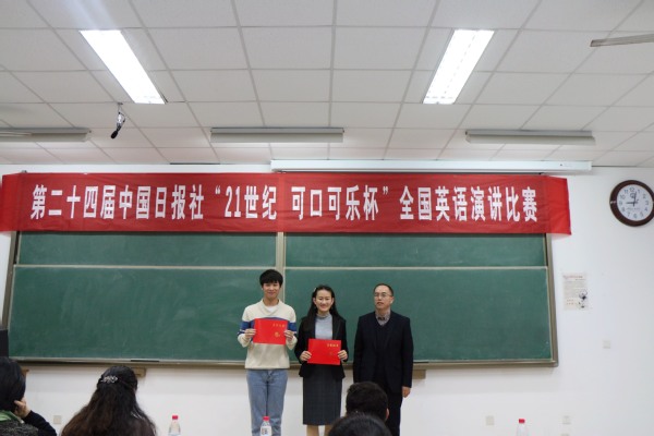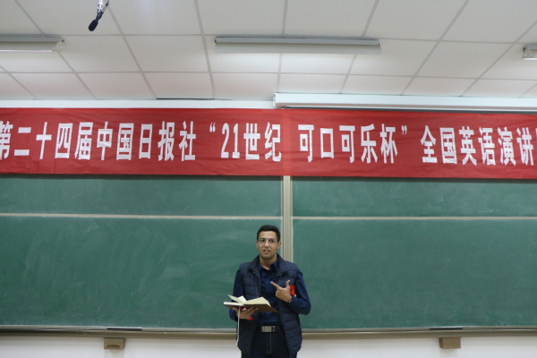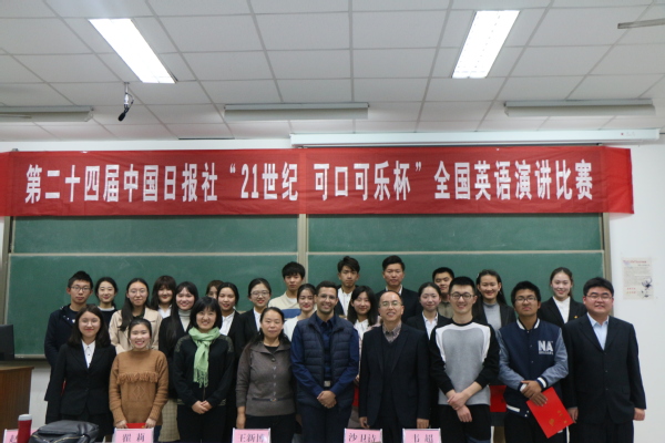 近日,由中国日报社21世纪英语教育传媒主办、文公司科技协会承办的第二十四届中国日报社“21世纪·可口可乐杯”全国英语演讲比赛于南教楼315室举行。本次比赛由文公司副经理、英语语言文学系教授王新博,英语语言文学系教授翟莉,大学英语二系副教授赵春霞,大学英语一系教师韦超,外籍职工沙卫诗担任评委,全校20名同学经过网络选拔后成功晋级并参加此次比赛。