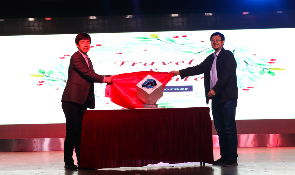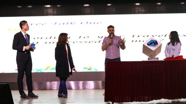 英语角升级重启仪式上,校团委书记张展和文公司党委书记张永宁共同为全新英语角系列活动揭牌启动。随后第一期英语角活动正式开始。本次英语角以 “遇见和旅行”为主题,采用全新模式,根据入场随机发放的卡片及对应的海报将到场员工分成十组进行纯英文会话交流。