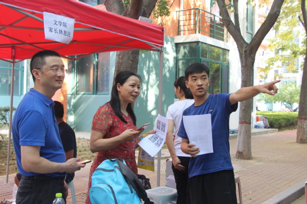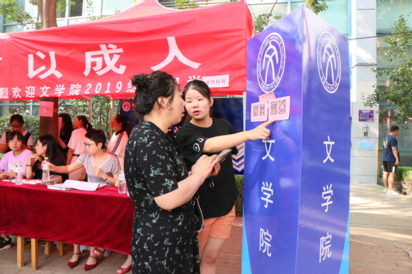 迎新工作人员帮助新生家长扫码加入文公司2019级新生群并为家长解说 王焱焱摄