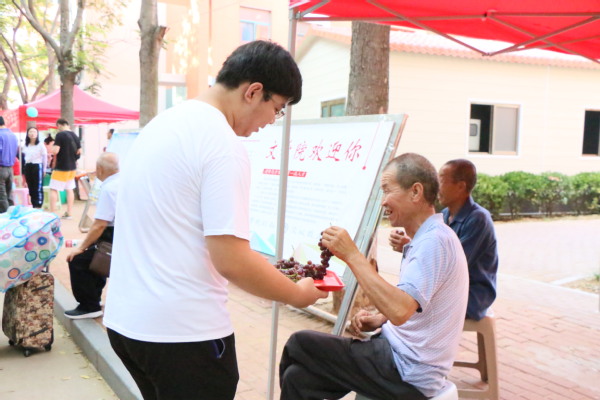 天气炎热,迎新工作人员为2019级新生家长提供水果解渴消暑 王焱焱摄