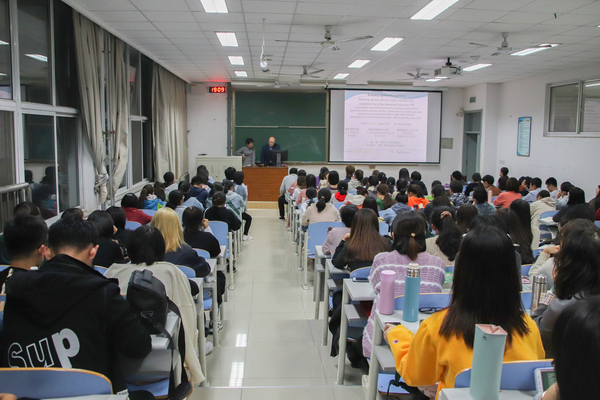 “大家好!”科布杰夫教授用中文向大家问好,在场师生报以热情的掌声,讲座氛围十分活跃。科布泽夫教授首先做了简单的自我介绍,随后便切入主题——中国文化在俄罗斯的传播。科布泽夫教授的讲座主要围绕以下三个部分展开。第一,科布泽夫教授从Китай(中国)词的起源开始,梳理了三百多年的俄罗斯汉学历史。第二,科布泽夫教授通过对汉语汉字的列举分析,引申到东西方文化的共同点及区别差异性,展现出世界文化的多元性与可交融性。第三,科布泽夫教授从哲学的角度,较为系统地分析了我国传统文化中的阴阳“两极”观点,通过举出生活中的事例,肯定了“两极说”的合理性。最后,孙大满作总结讲话,对科布泽夫教授的到来演讲再次表示感谢。