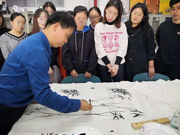 美术系党支部书记孙峰同志对与会人员进行介绍了此次活动的主题。美术系党支部成员王成宝同志向与会人员分享了从隋唐至明清乃至近代中国传统书画的笔法、用墨和着色变迁,王成宝同志的讲解旁征博引,与会人员积极交流互动。书画作为文化的载体,反映着时代背景的变迁,亦与国家的发展密切相关。王成宝同志以竹为题,勉励与会同志要高风亮节,不忘习近平总书记嘱托,“一枝一叶总关情”激起了与会人员的强烈共鸣。