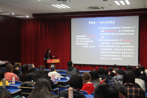 随后赵晓彬教授又向同学们介绍了人文价值观中的集体主义,赵晓彬教授指出,“村社是集体主义产生的经济根源,聚合性是集体主义产生的文化根源”。之后,赵晓彬教授从自由主义、现实主义、民主主义理想、现实主义理想四个不同角度出发,全面地讲解了俄罗斯文学中的理想主义,生动再现了那个特殊时代下,人们对沙皇专制制度和农奴制度的反抗,对自由民主生活的理想追求。赵晓彬教授在讲解俄罗斯文学的教谕功能时谈到:“欧洲文化的优良传统之一,就是强调文学家的道德责任,即寓教于乐。俄罗斯文学延续了欧洲文化传统,作家们通过自己的文学创作达到启迪、教诲和警示人类的作用”。