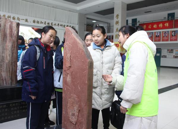 志愿者为员工们讲解化石文化 李文慧摄