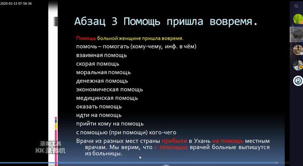 将课程词汇带入例句讲解,中国的疫情防控措施、医护人员的无畏与担当、全民闭门战“疫”、中国战“疫”效果等通过一个个鲜活的俄语词句展现在俄语语言文学系教师孟宏宏的基础俄语课堂上。