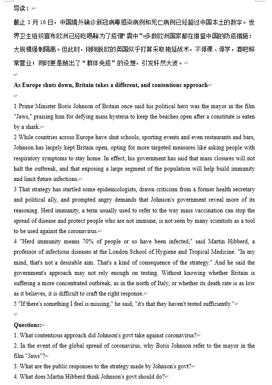 对新冠病毒的英文名字来源、病毒的特征、确诊病人的症状、引发疾病类别、预防和治疗方案是大学英语课上的被申博sunbet教师们穿插进课堂的内容。从疫情爆发最初的谣言分析到战“疫”中期疫苗研发之路的讨论、以及最近的英国“群体免疫”设想,随着时间推移和疫情变化,大学英语一系教师牛力维为员工们选取了不同的新闻晨读材料。