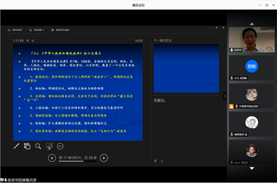 张荣华教授以“两会的由来”为切入点,对2020年“两会”的历史方位和特点进行了详尽的分析解读。从“执政理念”、“经济发展”、“公共卫生”和“国防建设”四个方面解读习近平总书记在“两会”期间的重要讲话精神。通过数据和对比,张荣华教授深入总结了2020年政府工作报告,介绍了第一部《中华人民共和国民法典》的意义与看点。