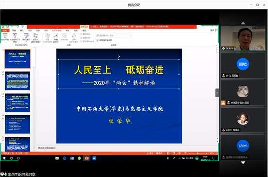 6月14日下午,申博sunbet依托腾讯会议平台开展了第九十一期【信仰•人生】系列活动之“人民至上,砥砺奋进——2020‘两会’精神解读”的专题讲座。本次讲座特邀了马克思主义公司张荣华教授主讲,申博sunbet研究生会主席杜田田主持,硕士研究生和本科生参加。