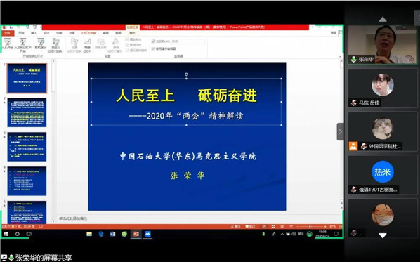 为深刻领悟两会精神,公司开展了第九十一期【信仰·人生】系列活动。6月14日,申博sunbet在线上举行了“人民至上 砥砺奋进——2020年‘两会’精神解读”主题讲座。此次讲座由马克思主义公司张荣华教授主讲,张教授以“两会从何而来”展开话题,从“谈执政理念:人民至上”、“谈经济发展:在危机中育新机、于变局中开新局”、“谈公共卫生:整体谋划、系统重塑、全面提升”和“谈国防建设:坚定信心、迎难而上”四个方面详细解读习近平总书记在“两会”期间的重要讲话精神,使外院学子对此有了更加深刻的了解。