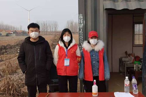 队员周丽在村口帮助社区工作人员给进出村民测体温