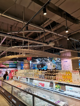 实践队主要对“盒马鲜生”的创新运营模式进行调研,从而深入体会数字时代对家乡产生的潜移默化的影响以及创新运营模式与家乡传统零售业的区别。实践队深入西安大都会一家“盒马鲜生”,进行参观。“盒马鲜生”具有传统意义上的超市布局,但除一般超市都有的商品外,还推出了特色生鲜及饭菜。同时“盒马鲜生”也开发了餐饮产业,提供海鲜商品一条龙服务,顾客可选择在店里对海鲜水产进行加工。相比传统超市的纸质标签,“盒马鲜生”全面采用电子标签,可自动变价,扫码可查看商品详情。