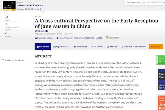 近日,公司大学英语青年教师孙烁在Asian Studies Review(2020年第2期)发表独撰文章“A Cross-Cultural Perspective on the Early Reception of Jane Austen in China”,实现了公司教师在SSCI来源期刊上发表论文零的突破。文章聚焦英国著名作家简·奥斯汀在中国的早期接受史。孙烁博士指出,简·奥斯汀作为世界文学史上比肩莎士比亚的女性作家,最初译介到我国时却并未引起国内学界的应有重视,这与林纾、魏易等清末翻译家对其小说中保守主义思想的误读息息相关。