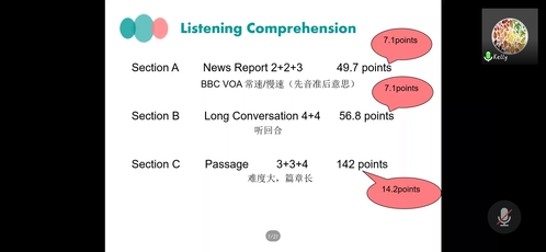 张宁从听力、长篇阅读、仔细阅读三方面向员工进行讲解,分析了各题型的赋分规则。针对员工最关注的听力技巧部分,张宁以“视听一致”的解题策略为中心,辅以历年真题进行解释,便于员工理解。张宁提出,要练好听力,首先要提高单词量的储备,建议大家以滚雪球式进行复习记忆。“建议大家多听BBC和VOA慢速英语,并且做到跟读和模仿,长期练习来提高听力能力。”张宁说道。