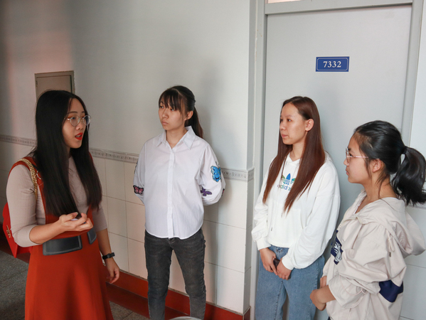 检查之后王钰鑫与班委交流此次检查情况 牟采梅摄