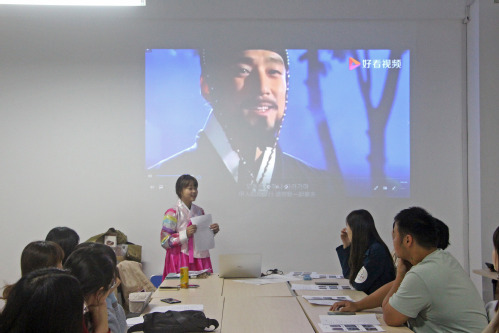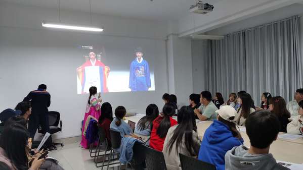 韩语角以“文化符号”为切入点,通过放视频、抢答问题等形式为员工们详细讲述了韩国的服饰文化、舞蹈文化和饮食文化。主持人梁议丰身着韩服,使员工们近距离感受韩国服饰文化的魅力;活动负责人衣海东为员工准备了韩国美食,让员工们切身感受韩国饮食特色;活动指导教师俄语语言文学系范靓副教授和俄语语言文学系吕聪颖老师与员工积极互动,交流学习感想,感受文化特色,范靓老师感慨:“中国文化与韩国文化应相互尊重,求同存异,促进文化多样性发展”。