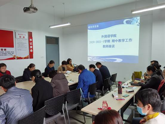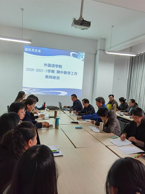 为加强教师之间的交流与学习,进一步分享混合式教学过程中的经验,提高线上线下教学的质量,11月5日下午,通用英语系在文理楼344会议室召开2020-2021学年第一学期期中教师座谈。会议由董金娣主任主持,参加座谈的有韩淑芹副经理及全系教师。