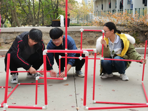 英语专业与俄语专业本科生依次参与本次活动。活动现场气氛活跃,本次项目共有“人多足少”、“怒火中烧”、“画肖像”、“穿越火线”、“你画我猜”、“呼吸的力量”五个项目。通过抽扑克牌的方式员工按照四个花色划分四个小组。热身项目是由每个小组内互记名字,被点名的人说出该小组全体人员的名字。