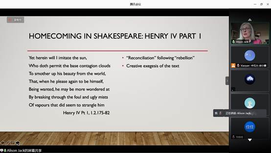 本次讲座主题为“Homecoming in English Literature”(英美文学中的归乡研究)。Alison Jack博士首先介绍了“浪子回头”故事的来源、内容和“prodigal”的不同意义,指出“浪子回头”的故事是英语文学中的一个重要故事,归乡以及孩子与父母之间的复杂关系在许多诗歌、小说和戏剧中都有提及。Alison Jack博士通过解读莎士比亚的《李尔王》、乔治·艾略特的《亚当·贝德》、布雷特·哈特的短篇小说和伊丽莎白·毕晓普的诗歌等文学文本,探讨儿子离家出走所造成的裂痕及其回归的可能性。Alison Jack博士的讲解使师生们看到,归乡是人们向往的,但在英语文学中,归乡却并不总是能带来幸福的结局。最后,参会者对“浪子回头”故事中人物的解读,及其对不同国家、不同文化下的文学作品的归乡主题影响等问题展开了热烈的讨论。