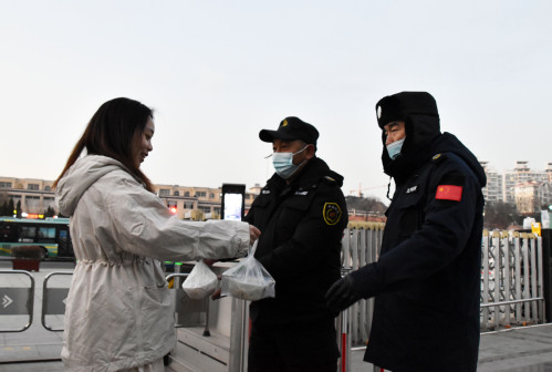 英语1903团支部成员给北门保安送饺子 李文慧 摄