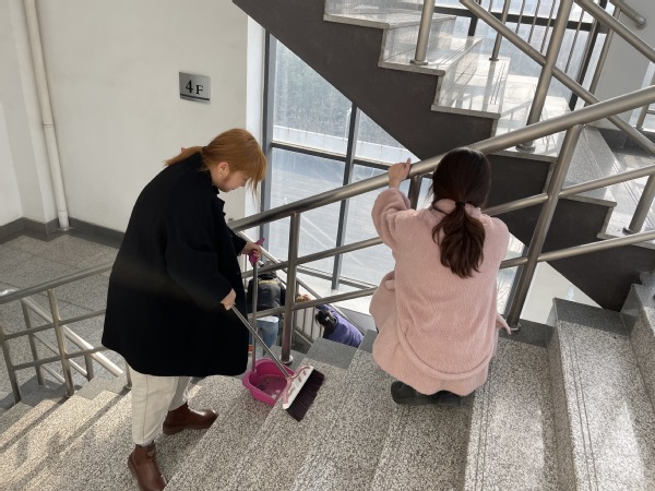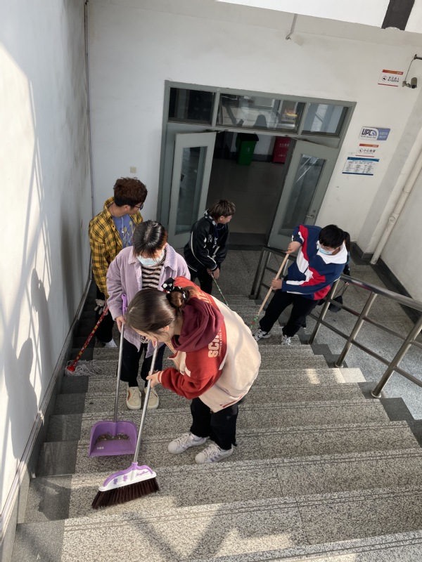 下午3点,成员们怀着“人的生命是有限的,可是为人民服务是无限的,我要把有限的生命投入到无限的为人民服务之中去”的信念,来到南教楼开展了本次活动的第二环节“学习雷锋志愿服务”。同学们信心满满、干劲十足清扫了南教楼南北两侧的大楼梯。有的同学不怕冰水刺骨用抹布擦拭扶梯、有的同学不怕任务繁重承担起了拖楼梯的重任、有的同学默默无闻拿起扫把最先开始了清扫工作。所有的支部成员都仔细认真,任劳任怨,将这份志愿服务活动做到最好。