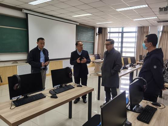 教务科科长祝德显介绍了公司考点教室资源情况,王新博介绍了公司实验室建设和设备资源配置情况,韩清英介绍了公司机考考点资源情况。双方还就考点组织指挥、设备运行、试卷保密等具体事宜做了深入交流。座谈会后,孙杰主任一行3人实地考察了文理楼机房、南堂语言实验室、公司教学服务中心控制室等,对公司近几年语言实验室建设成效给与肯定。