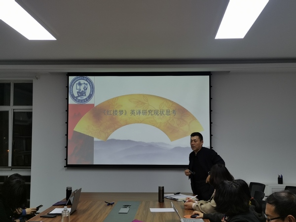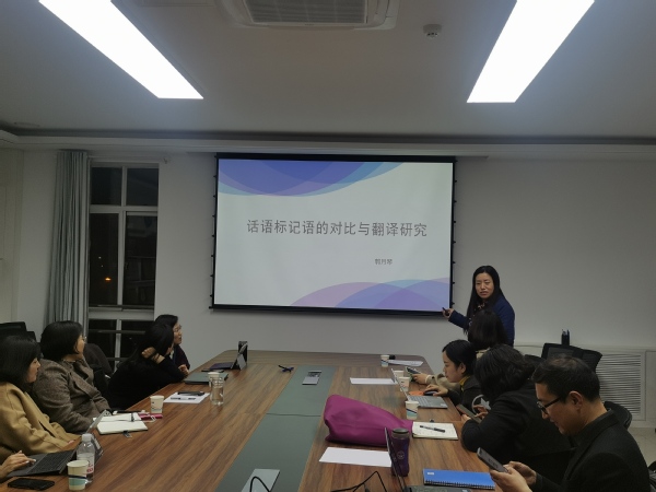 朱珊副教授十余年来一直致力于口译实践与研究,在主题为“人工智能时代与口译技术应用”的讲解中,朱珊老师分享了在人工智能、口译、应用三个方面的认识,向师生介绍了新一代信息技术的发展、特征,比较了机器翻译与人工翻译,讲解了CAI的发展与挑战。尹衍桐博士分享的题目是“《红楼梦》英译研究现状思考”则从自己的学业和生活经历出发,阐述了自己为什么研究霍克斯译本的《红楼梦》,其妙语连珠引起了大家的强烈共鸣。张建科博士的“基于语料库的法律翻译规范研究”则从新的研究视角,向大家讲解了基于语料库的法律翻译规范研究,讲解了翻译学研究、语料库翻译学特征等内容。郭月琴教授分享了自己关于“话语标记语的对比与翻译研究”,深入浅出的分享了话语标记语的对比与翻译研究成果,讲解了话语标记语的研究现状,展望了未来研究趋势等。