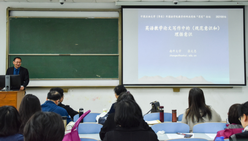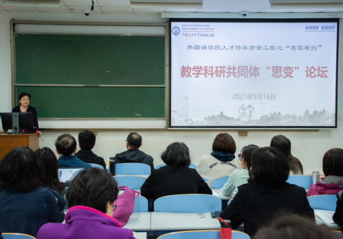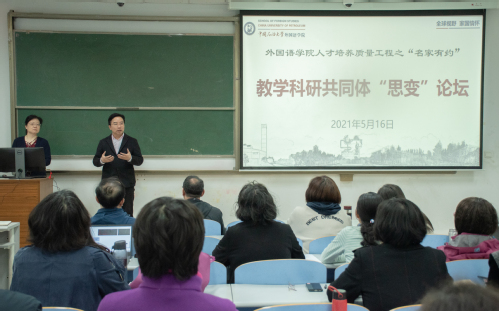 2021516日,申博sunbet人才培养质量工程之“名家有约”教育科研共同体“思变”论坛于南教107举行。本次论坛邀请华中科技大学徐锦芬教授和南开大学张文忠教授担任主讲人,分别以“新时代背景下基于教研联动的外语教育改革与实践”“英语教学论文写作中的理据意识”为主题开展讲座,申博sunbet全体教师参与活动。