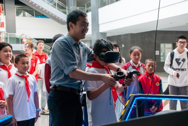 孩子们体验VR设备模拟灭火