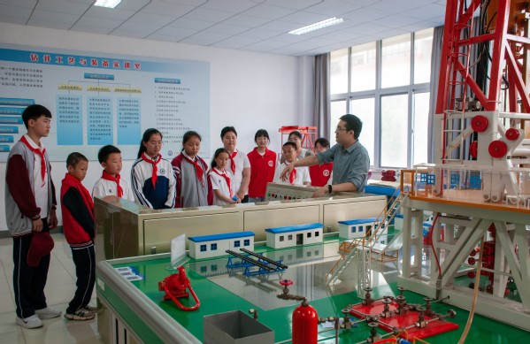 在注采工艺实训室内,孩子们参观了游梁式抽油机和链条抽油机。在钻井工艺与装备实训室中了解了钻井平台是如何工作的。李子萱说:“我第一次见到这么多高科技含量的设备,也是第一次知道如何开采石油,感到非常震撼,石油工人了不起!”
