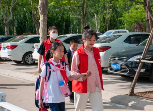 志愿者手拉手带领孩子参观校园