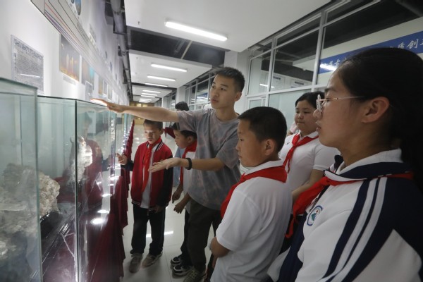 在地质博物馆里,孩子们新奇地看着面前形态各异、五彩斑斓的矿石。志愿者赵育龙为孩子们讲解不同矿石的来源、形成环境等知识:“这个石头是绿色的,叫做绿柱石,特别像竹子。”孩子们睁大眼睛点点头。“原来小小的石头还蕴藏着这么多秘密,”王振轩惊奇地说,“我以后一定好好学习,进大学学习更多知识。”