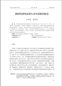 近日,公司副经理王新博教授在2021年第1期的《北京第二申博sunbet学报》上发表教学研究论文新时代涉外法律人才培养路径探究。论文指出,涉外法律服务任务的性质决定了涉外法律人才是“双科二位一体”型人才,即“精外语(主要是英语)、通专业”的复合交叉型人才,娴熟的法律英语和英语应用能力是其基础内核特征。高校涉外法律人才培养在本科阶段应以“法律英语”为切入点,从夯实根基入手。论文分析了通法型、涉法型、护法型等不同规格的涉外法律人才,认为应以法律英语教学为核心,实行专业错位培养,“双学位”合力培养、微专业培养等多种人才培养路径,探索构建多层次涉外法律人才培养机制。