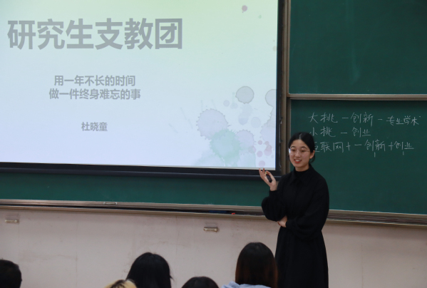 杜晓童分享了自己在研究生支教团的经历,为同学们介绍了该项目的政策背景、条件要求以及建议。“希望同学们‘用一年不长的时间,做一件终身难忘的事’。欢迎热爱支教事业的学员们积极参与进来,这对于激发大家的社会责任意识、服务意识和奉献意识都有着很大的帮助。”杜晓童说道。