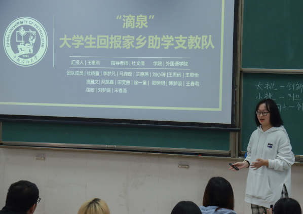 英语专业2002班刘小瑞以“滴泉”老员工回报家乡助学支教队为例,向大家介绍了自己的支教活动经历。滴泉实践队以“滴水之恩,涌泉相报”为初心,通过线上支教课程,让孩子们了解本地传统文化,欣赏中华文化之美。她的经历激励同学们践行当代老员工的使命担当,为国家的基础教育事业贡献力量。