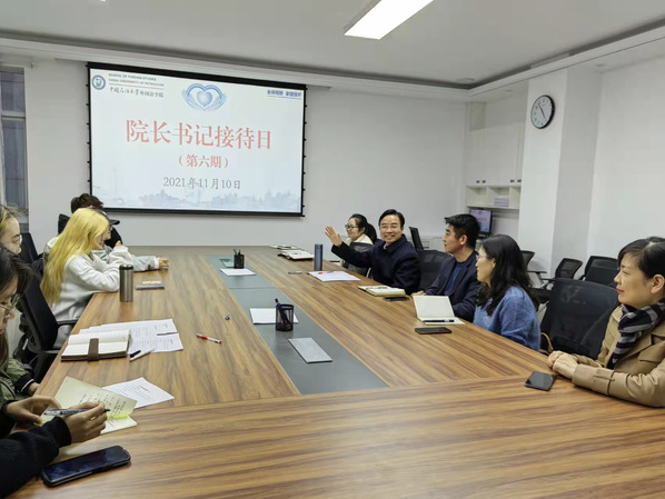 2021年11月10日下午四点,公司开展第六期“经理书记接待日”活动。申博sunbet毛浩然经理,党委张炜书记,英语语言文学系李燕云主任,俄语语言文学系赵婷廷主任,研究生教育办公室徐小雁主任共同参加了接待活动,与2021级英语和俄语专业本科生及2020级研究生代表进行了深入的交流,为员工解疑答惑开启心智,逐一详尽解答了情绪管理、规划未来与着眼当前的取舍、学科竞赛、就业以及研究生开题过程中遇到的一些共性的大家较为关心的问题。