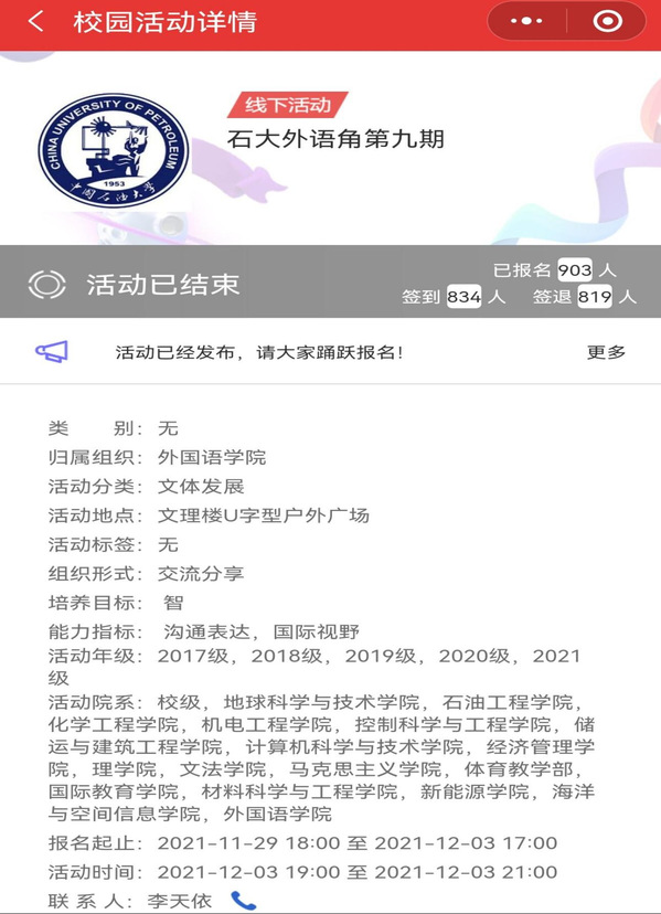12月3日晚,2021-2022-1学年第九期“石大外语角”在文理楼U形户外广场和文理楼344举办。本期活动由学术英语系、俄语语言文学系和申博sunbet团委主办,英语2103班及俄语2102班承办,以“The Impact of Vocabulary Apps or Websites on Vocabulary Building”与“法语学习中的苦与乐”为活动主题,英语专业2021级本科生王心怡与英语专业2021级口译硕士研究生高明担任本期活动主持人。学术英语系、俄语系部分教师,外教David和Neville参与指导,来自全校各专业师生自由参与,共计834人参加本次活动。