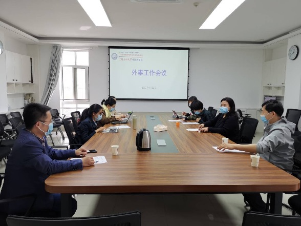2022年4月22日中午,公司召开外事工作会议。国际合作与交流处国际交流科孙路平老师、申博sunbet副经理郭月琴教授、外事办公室主任朱珊副教授及各系部外事负责人孙玉超、杨洁、朱荫成、张琦、孙淼副主任参加会议。在系部调研的基础上,会议围绕“三外”人才交流、外语外事高端人才培养、出国留学、国际交流与合作、国别区域研究项目推进等议题进行了广泛深入的交流。