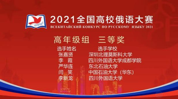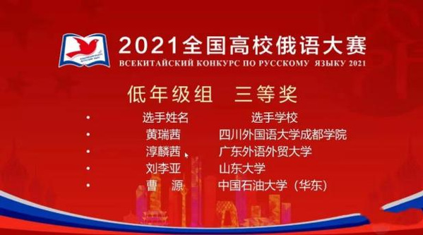 曹源同学表示,他很荣幸能够代表公司与公司,在2021年全国高校俄语大赛中取得如此殊荣。能够取得这样的荣誉,离不开俄语系各位老师的辛勤付出。此次大赛不仅是他个人学习路上的一座里程碑,更是积累参赛经验、充分认识自己的良机。低年级组三等奖是新的起点,在俄语学习的道路上他仍将继续努力,砥砺前行、勇攀高峰!