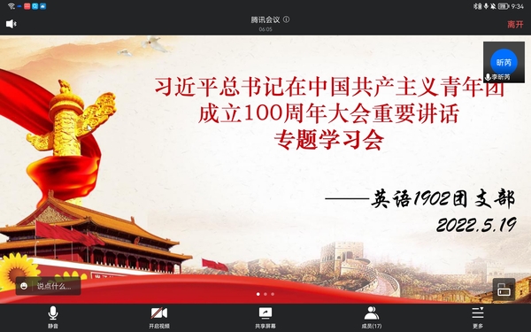 为培养团员青年爱国爱民、锤炼品德、勇于创新的实学实干精神,5月19日晚,英语1902团支部于线上开展了“习近平总书记在庆祝中国共产主义青年团成立100周年大会上的重要讲话精神”专题学习会,以“生逢盛世,肩负重任”作为本次活动主题,支部全体成员共同参与,反响十分热烈。
