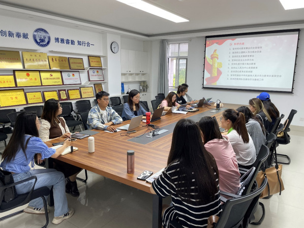 兼职辅导员崔荣荣带领大家共同学习了习近平总书记关于教育的重要论述。她从《习近平总书记教育重要论述讲义》的第一部分出发,围绕“加强党对教育事业的全面领导”、“思想政治工作是公司各项工作的生命线”和“全面加强和改进教育系统党的建设”三个方面展开详细解读。崔荣荣指出,党的领导是教育事业发展的“定海神针”,只有坚持党对教育事业的全面领导,才能在更高水平上实现教育战线思想上的统一、政治上的团结、行动上的一致,才能确保教育事业发展的正确方向。其次,她指出切实加强思想政治工作,必须将其贯穿公司产品全过程,实现全员育人、全程育人、全方位育人。最后,崔荣荣强调,在当下我们应该时刻关注党对待教育事业的方针政策,矢志不渝地坚持党对教育事业的全面领导,坚定地走好中国特色社会主义教育发展道路。