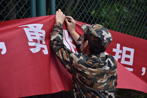 清晨,申博sunbet四团九连的同学们应哨而出,准时在军训场地集合,并在教官的指令下迅速排好队形。与此同时,见习兵们清扫场地、张贴横幅、拍摄撰稿,认真履行着后勤保障及宣传工作。四团九连分工明确,有条不紊地进行着正式集训前的准备。