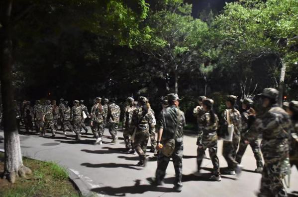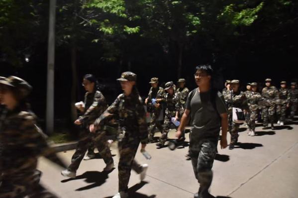 伴着哨声,2021级全体本科生身着迷彩服,分3个梯队先后在操场集合。22点50分,位于第一梯队的申博sunbet军训团伴着夜色踏上了征途。拉练队伍按照行军路线从操场出发,途径体育馆、国旗广场、小黄山,最后返回操场。为保障拉练的顺利进行,集团提前部署,为教官和老师配备了广播设备和照明设备,途中还有医护人员陪同跟随,以应对突发状况。
