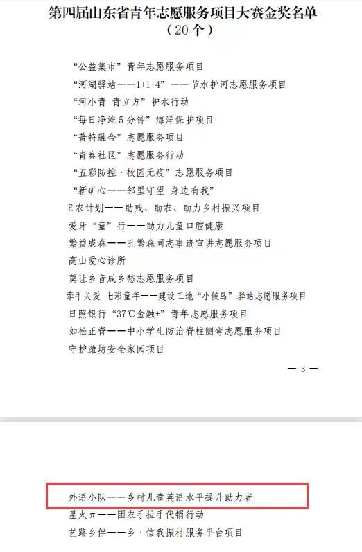7月27至28日,第四届山东省青年志愿服务项目大赛决赛在日照成功举办,大赛评审采用“材料审阅+路演答辩”的方式于线上进行。经过激烈角逐,公司由相欣余、梅琳、王英明指导的“外语小队——乡村儿童英语水平提升助力者”项目从入围决赛的148个项目中脱颖而出,获得大赛金奖,实现了申博sunbet志愿服务项目新突破。